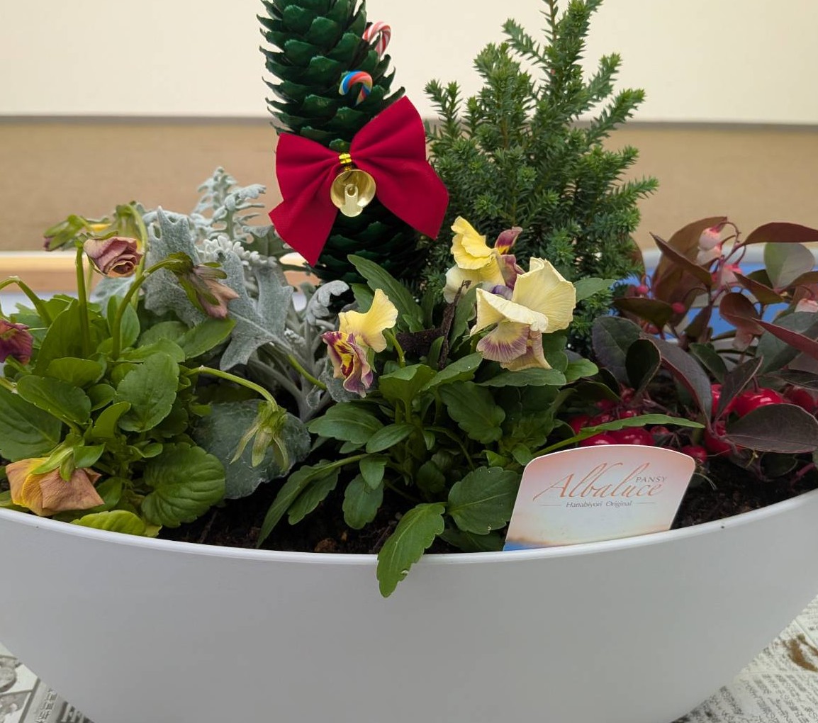 今回は冬の寄せ植えでテーマがクリスマスとの事でヒバ・チェッカーベリー・白妙菊・パンジーで寄せ植えです。